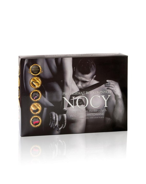 „Kiedy wszedł do sypialni, stałam jak sparaliżowana. Czułam w sobie mieszankę lęku i dzikiego pożądania na myśl o tym, co zaraz wydarzy się między nami. Mały pejcz, który leżał na pościeli był zapowiedzią nowej przygody, ale także... Myśli zaczęły uciekać, kiedy poczułam, jak obejmuje moje dłonie i związuje zimną liną, zakłada opaskę na oczy... na swoich pośladkach czułam twardy dotyk jego męskości... czułam, że już jest gotowy, by wejść ... ale to był dopiero początek naszej przygody..." Chcesz doświadczyć takich emocji? Chcecie razem wybrać się w erotyczną podróż do krainy Christiana? Pejcz, kulki gejszy, związane dłonie i stopy... pieszczoty z dużą szczyptą pikantności - to wszystko czeka na Was zamknięte w tym opakowaniu. Jeżeli zawsze chciałaś spróbować, ale nie wiedziałaś jak zacząć... Jeżeli zawsze liczyłeś na bardziej pikantny seks między Wami...kup „Pięćdziesiąt rozkosznych nocy" i doświadczaj nowych emocji w sypialni. To najbardziej pikantna gra w Polsce. Inspiracją do stworzenia gry „Pięćdziesiąt rozkosznych nocy" była popularna książka, opowiadająca historię fascynacji przemilczaną sferą seksualności. „Pięćdziesiąt rozkosznych nocy" to lekkie potraktowanie tematów Bondage czy SM, nie przekraczające pewnych granic. Zagrajcie w „Pięćdziesiąt rozkosznych nocy", a dowiecie się dlaczego będzie to jedna z najlepiej sprzedających się polskich gier erotycznych najbliższych lat.