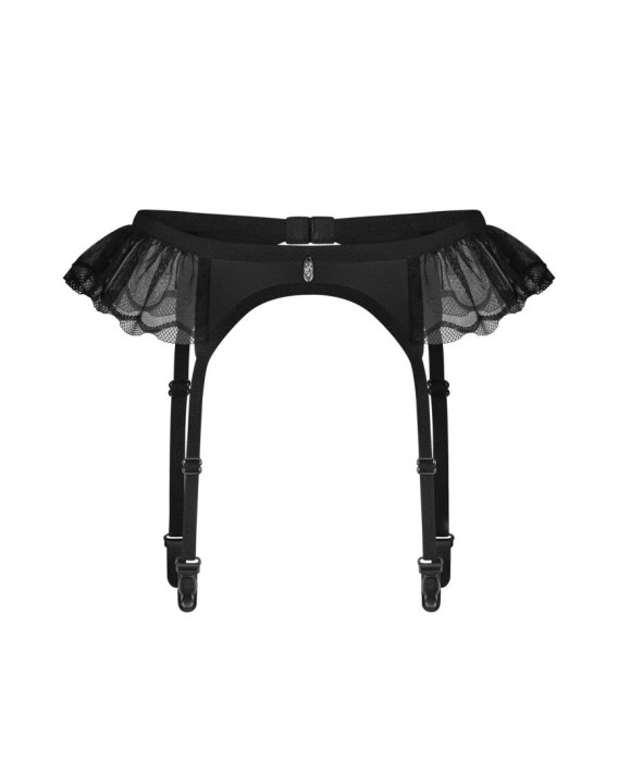 Tiulowa falbanka dodaje lekkości, a głęboka czerń podkreśla wyrafinowany charakter bielizny. Regulowane paski umożliwiają idealne dopasowanie pończoch, zapewniając wygodę i stabilność. Z tyłu znajduje się kilkustopniowe zapięcie, które pozwala na precyzyjne dopasowanie do sylwetki.